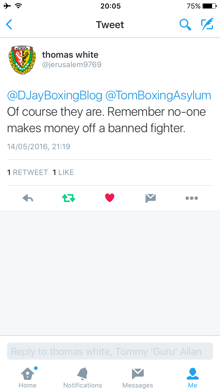 Now we as fans and boxers living within the rules are being let down miserably by the Governing Bodies the WBC,WBO,WBA and IBF seem to take the view of punishment for getting caught rather than take a hard line for cheating ,you might think that this is a ridiculous statement but just look at the these cases of drug cheats :