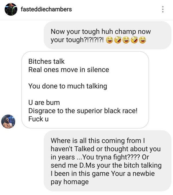 Then a week or so after this twitter exchange there was something even more bizarre and a bit more sinister to come from Rogue AJ on twitter . Eddie Chambers took to twitter claiming Joshua had sent him a tirade of abuse on twitter , and even a slight undertone of racism , again have a look .
